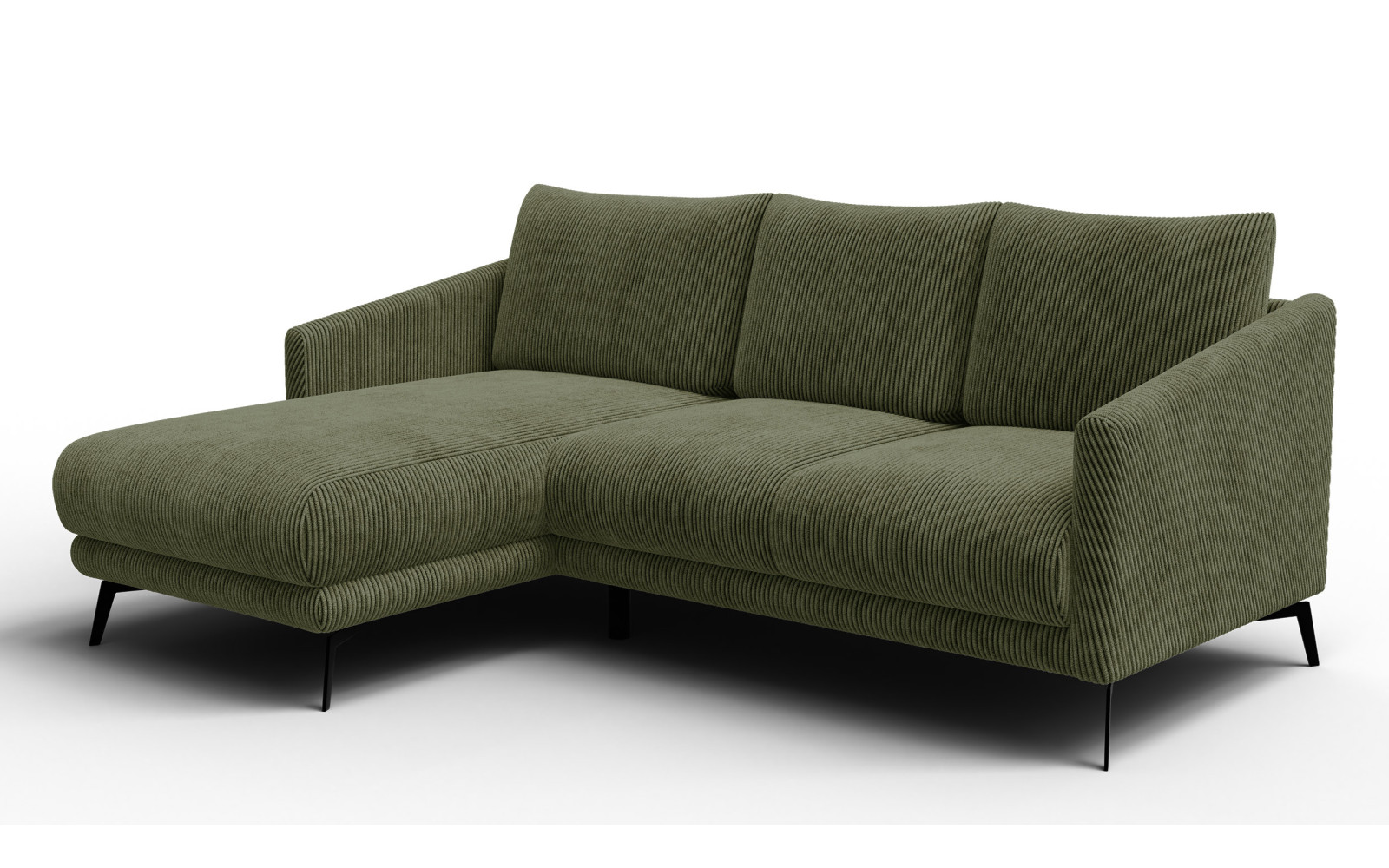 Die Ästhetik dieses Sofas wird durch die schwarzen Metallfüße perfekt abgerundet, die einen stilvollen Kontrast zum warmen Grünton des Bezugs bilden. Diese Kombination sorgt für eine moderne und zugleich zeitlose Optik, die sich harmonisch in verschiedenste Einrichtungsstile einfügt. Ob in einem minimalistischen Loft oder einem gemütlichen Landhaus, dieses Cordsofa setzt stets einen geschmackvollen Akzent. Die großzügige L-Form bietet ausreichend Platz für die ganze Familie oder entspannte Abende mit Freunden, ohne dabei wuchtig zu wirken.