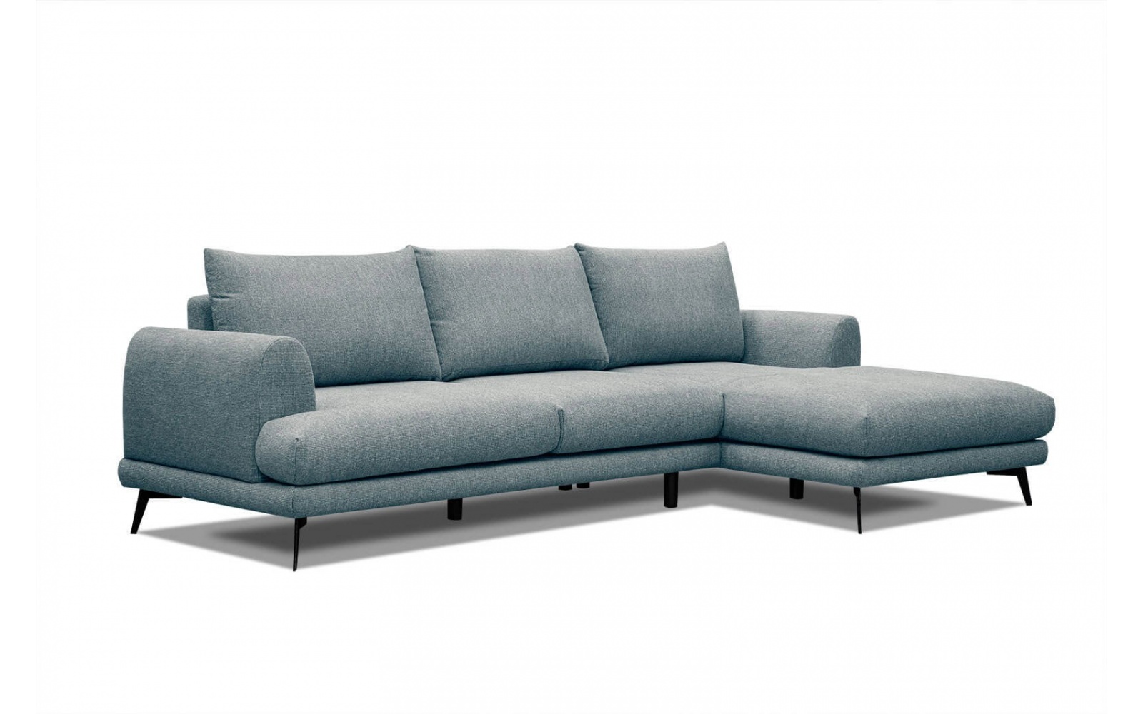 Die schwarzen, metallischen Beine des Ecksofas tragen zum Schwebeeffekt bei und erzeugen eine besondere Anziehungskraft. Dieses Ecksofa setzt auf den Komfort und benutzerfreundliche Oberfläche, mit weicher Polsterung und angenehm geformten Armlehnen. Darüber hinaus ermöglicht die Chaiselongue eine äußerst bequeme halbliegende Sitzposition.