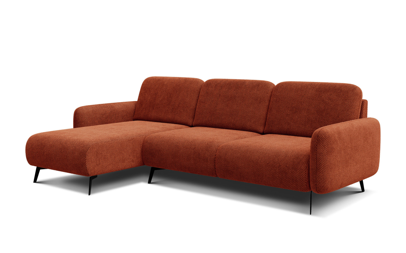 Wer sich für das Ecksofa 4-Sitzer links FEBE, dunkelorange entscheidet, holt sich ein Stück moderne Kunst ins Haus. Die schwarzen, 16 cm hohen Metallfüße heben den kräftigen Korpus elegant an und sorgen für eine visuelle Leichtigkeit, die das Gesamtbild perfekt abrundet. Dieser Kontrast zwischen dem warmen Stoff und den kühlen, dunklen Beinen zeugt von einem ausgeprägten Gespür für zeitgenössisches Design.
