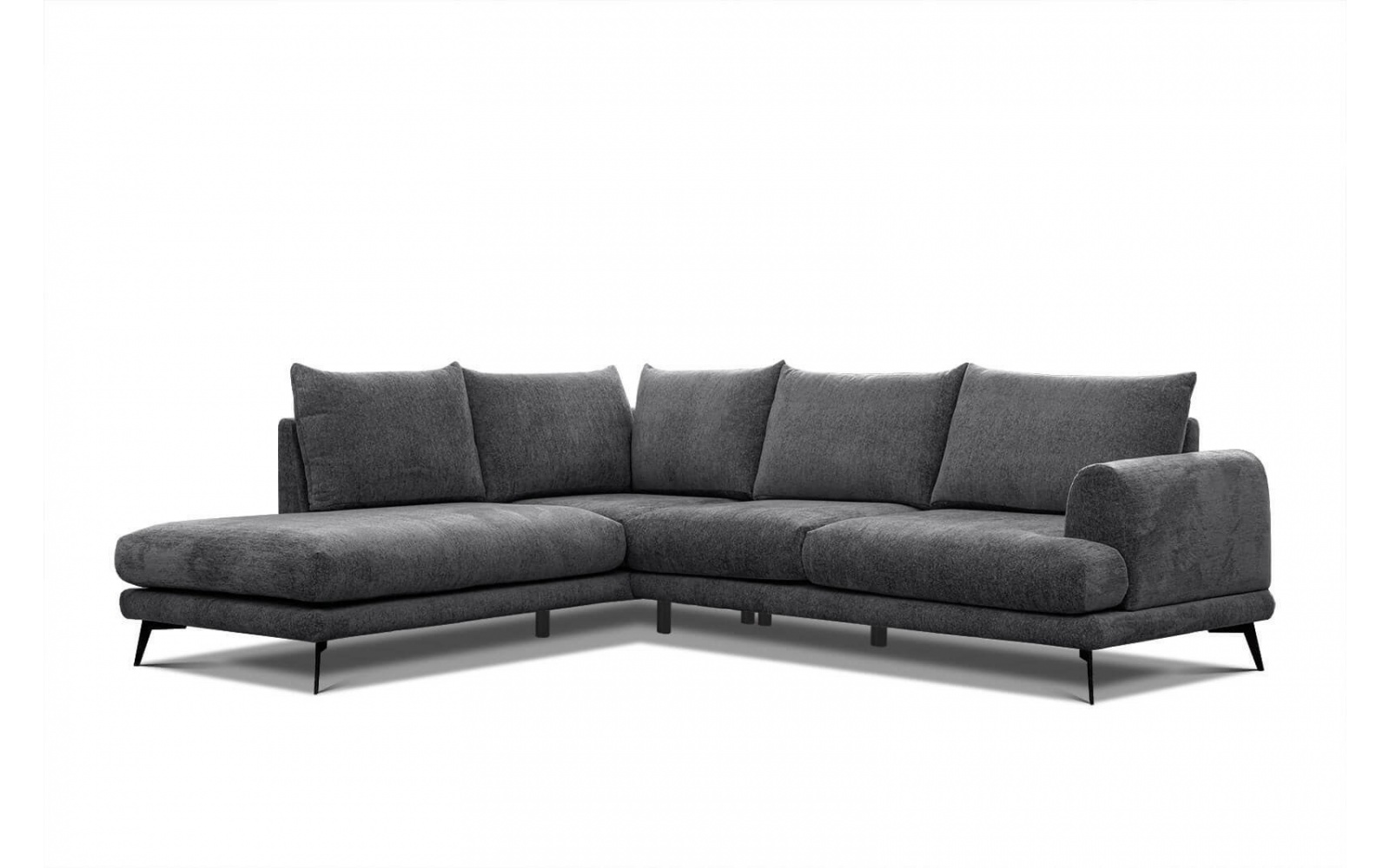 Das Ecksofa wird auf einer erhöhten Basis aus schwarzen, metallischen Beinen präsentiert, wodurch es die Leichtigkeit und ein modernes Aussehen erhält. Diese subtile Balance zwischen klassischer Anmutung und dem zeitgemäßen Aussehen macht es zu einem perfekten Begleiter für verschiedenste Einrichtungsstile.