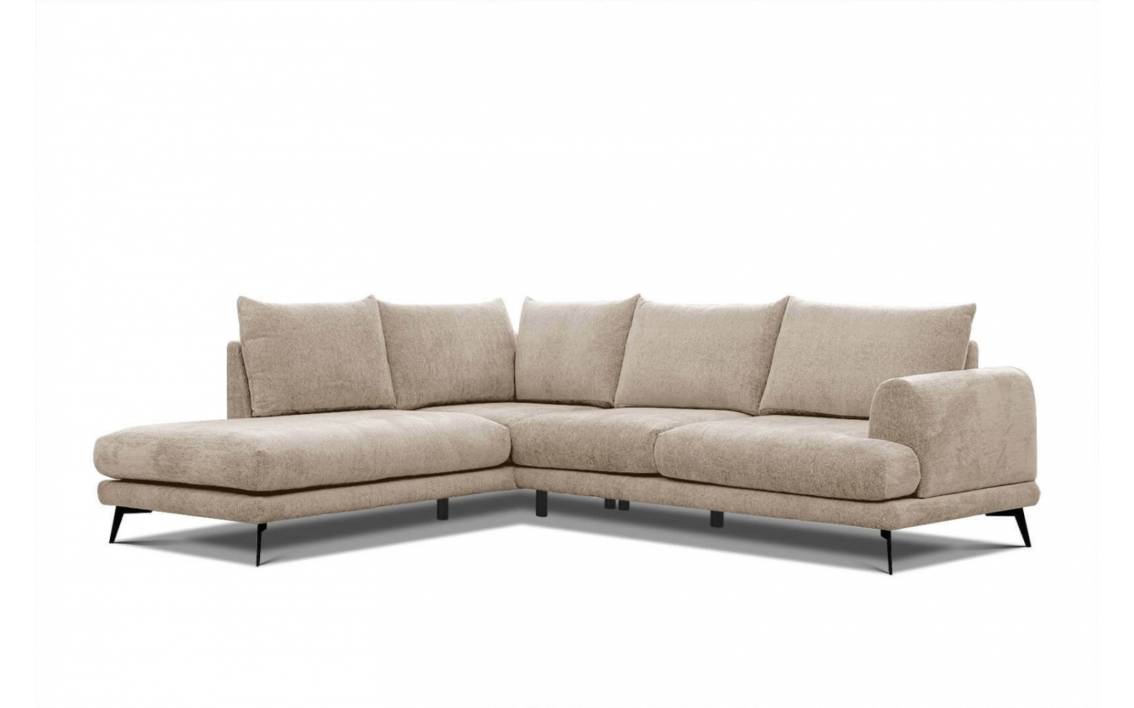 Das Ecksofa wird auf einer erhöhten Basis aus schwarzen, metallischen Beinen präsentiert, wodurch es die Leichtigkeit und ein modernes Aussehen erhält. Diese subtile Balance zwischen klassischer Anmutung und dem zeitgemäßen Aussehen macht es zu einem perfekten Begleiter für verschiedenste Einrichtungsstile.
