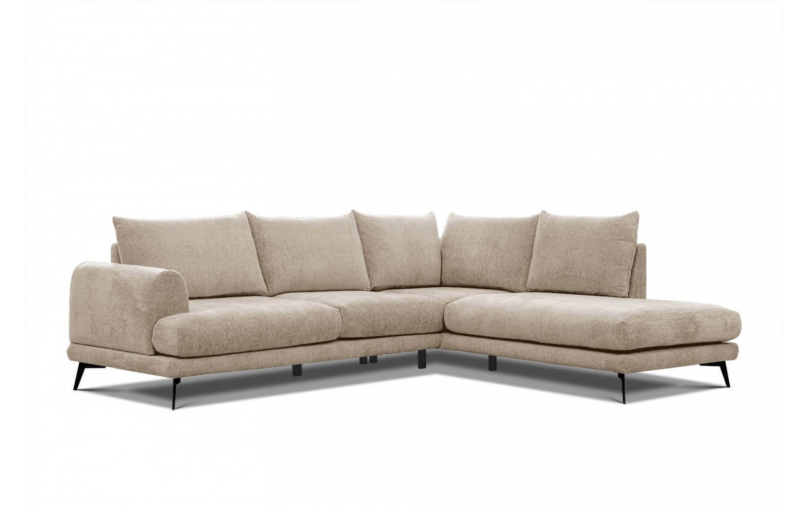 Das Ecksofa wird auf einer erhöhten Basis aus schwarzen, metallischen Beinen präsentiert, wodurch es die Leichtigkeit und ein modernes Aussehen erhält. Diese subtile Balance zwischen klassischer Anmutung und dem zeitgemäßen Aussehen macht es zu einem perfekten Begleiter für verschiedenste Einrichtungsstile.