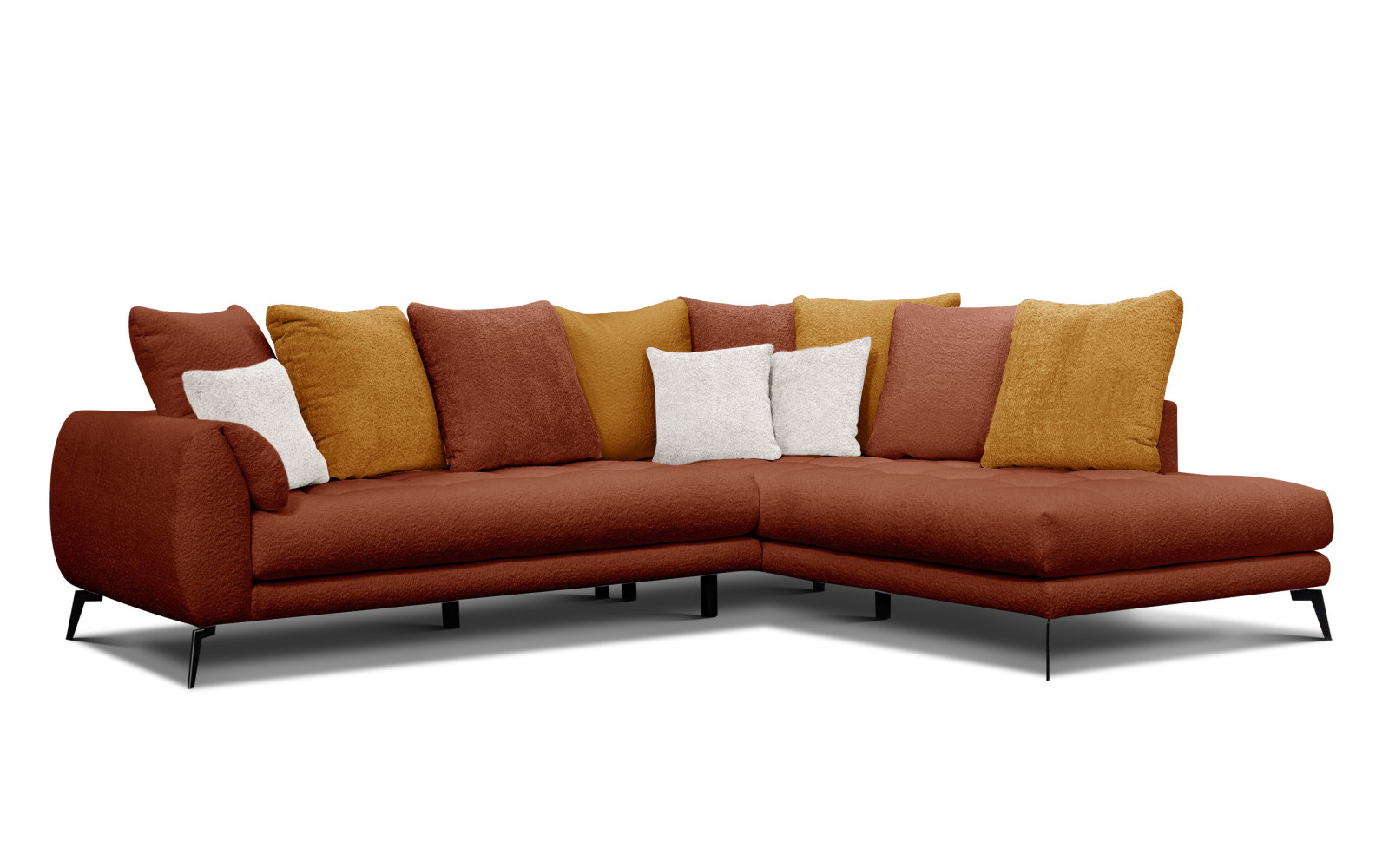 Das außergewöhnliche Ecksofa 5-Sitzer CALME, dunkelorange und écru ist ein visuelles Meisterwerk, das mit Kontrasten spielt und dabei eine harmonische, fast künstlerische Ausstrahlung besitzt. Die Kombination aus dem warmen, erdigen Dunkelorange und dem frischen, hellen Écru verleiht diesem Möbelstück eine Lebendigkeit, die jeden Wohnraum sofort aufwertet. Der angesagte Bouclé-Stoff mit seiner weichen, strukturierten Oberfläche verbindet die beiden Farben haptisch und macht das Sofa zu einem wahren Genuss für die Sinne. Es ist ein Design für Menschen, die das Besondere suchen und Mut zur Individualität haben.