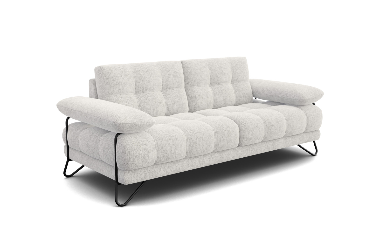 Die schwarzen, schleifenförmigen Metallbeine setzen einen bewussten, modernen Kontrast zur hellen Polsterung. Sie verleihen dem Sofa einen Hauch von Industrial-Chic und sorgen dafür, dass der großzügige Korpus optisch über dem Boden schwebt. Dieser Stilbruch ist gewollt und macht das Sofa zu einem spannenden Designobjekt, das in jedem Wohnzimmer die Blicke auf sich zieht.