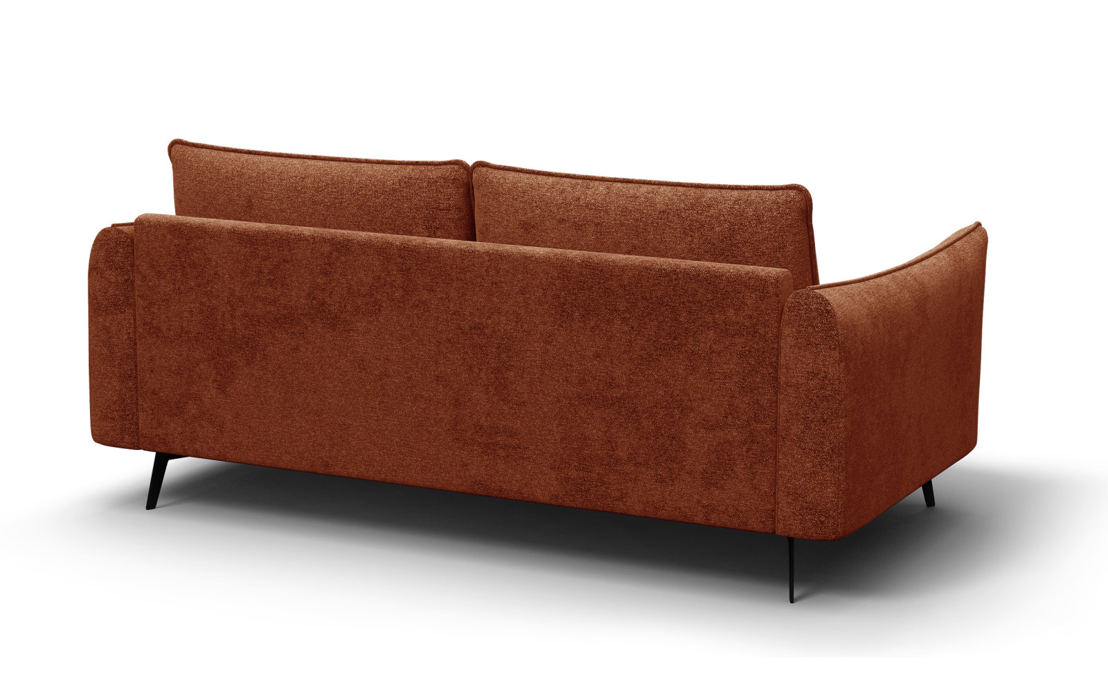 Die schwarzen, schlanken Metallbeine bilden einen starken, graphischen Kontrast zum leuchtenden Orange. Sie erden das Design und verleihen dem Sofa eine moderne, urbane Note. Durch die Höhe der Beine wirkt das Sofa leicht und luftig, was dem Raum trotz der kräftigen Farbe eine gewisse Offenheit bewahrt.