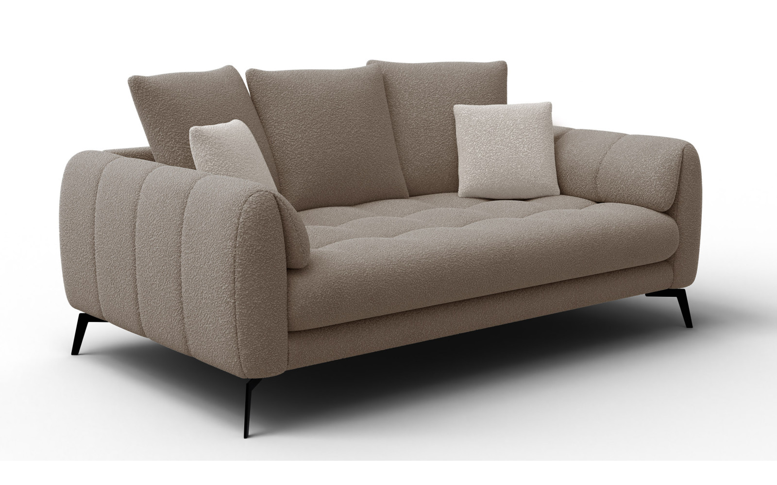 Die Formsprache dieses Modells ist bewusst minimalistisch gehalten, um die hochwertige Textur des Stoffes in den Vordergrund zu rücken. Dennoch wirkt das Design niemals kühl. Im Gegenteil, die Kombination aus einer fließenden Struktur und den voluminösen Sitzkissen schafft eine einladende, fast samtige Optik. Es entsteht eine weiche, gepolsterte Wand, die Ihnen Sicherheit und Geborgenheit vermittelt. Dieses Sofa wird schnell zum unangefochtenen Mittelpunkt Ihres Wohnzimmers werden.