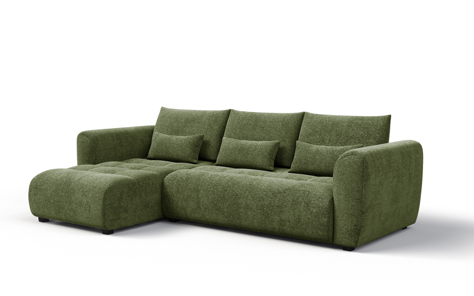 Bringen Sie mit dem Ecksofa 4-Sitzer links SORENO, dunkelgrün eine Note von natürlicher Eleganz und tiefer Ruhe in Ihr Zuhause. Dieses exquisite Möbelstück verkörpert eine seltene Harmonie aus modernem Design und klassischer Gemütlichkeit, die jeden Raum augenblicklich aufwertet. Die sanft abgerundeten Formen der Rückenlehnen und Seiten verleihen dem Sofa eine organische Anmutung, die außergewöhnlich weich und einladend wirkt. Es ist, als würde das Sofa den Betrachter sanft umarmen wollen, was es zum idealen Mittelpunkt für ein stilvolles und zugleich behagliches Wohnzimmer macht.