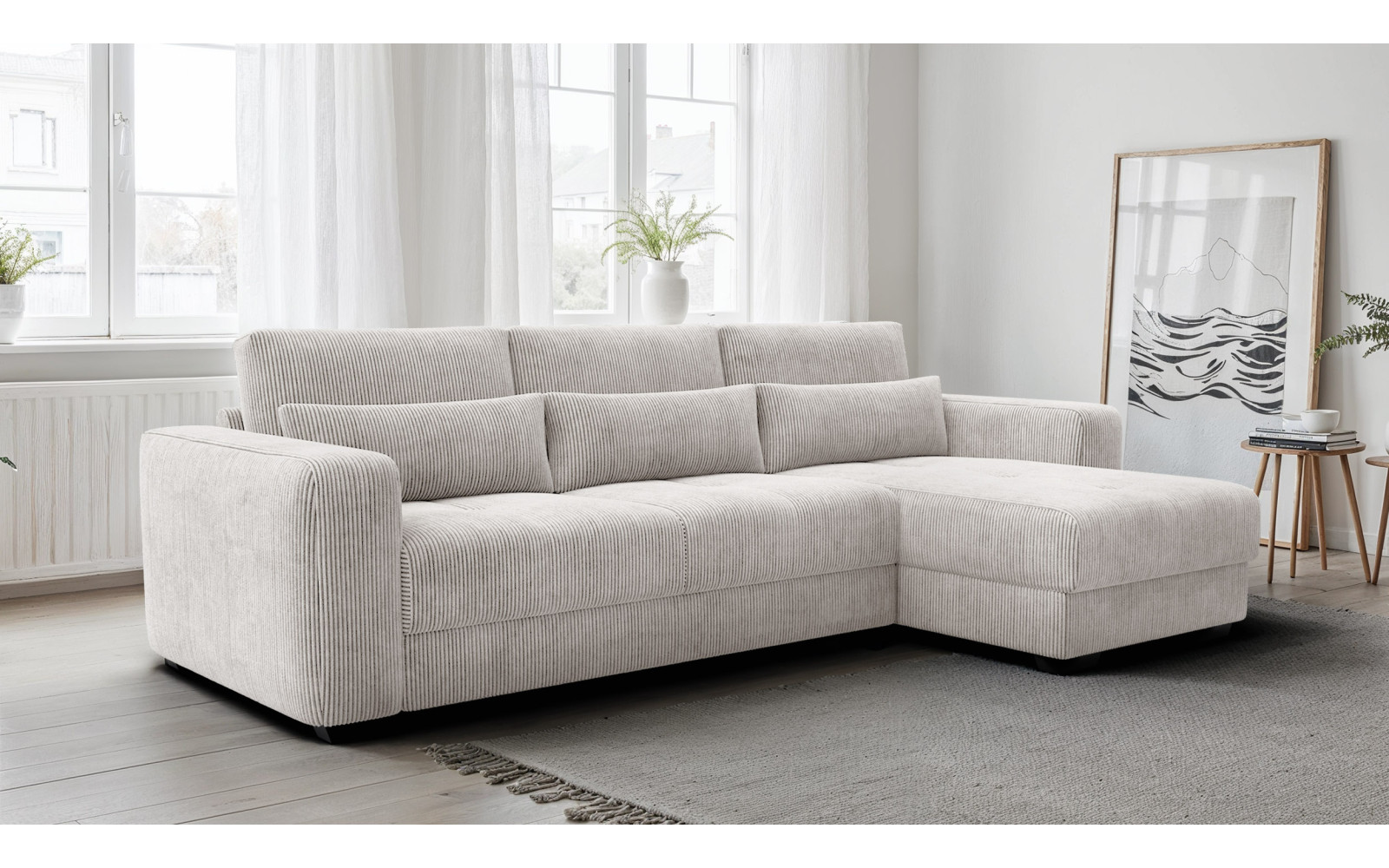 Komfort steht bei dem Ecksofa 4-Sitzer rechts OLI, perlweiß an erster Stelle. Ausgestattet mit hochwertigen, mittelfesten Schaumstoffen, bietet es eine ergonomisch optimale Unterstützung, die sowohl beim Sitzen als auch beim Liegen spürbar ist. Die Polsterung ist flexibel und passt sich dem Körper an, ohne dabei die Form zu verlieren, was für eine langanhaltende Freude an dem Möbelstück sorgt.