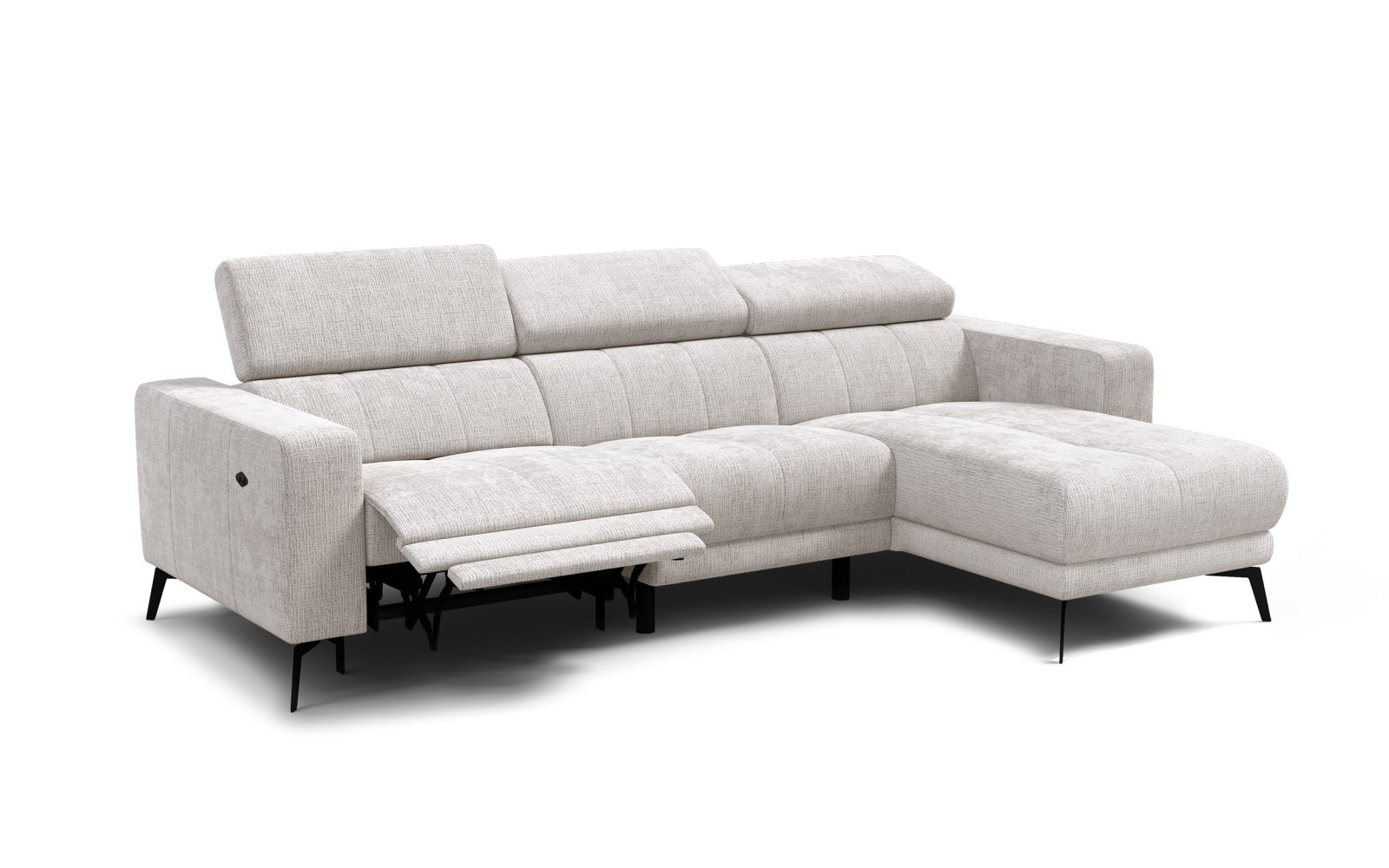 Ecksofa 4-Sitzer MORELLO in cremefarbenem Chenille-Stoff, weich im Griff und strapazierfähig (45.000 Martindale), für langlebigen Komfort und ein angenehmes Sitzgefühl.