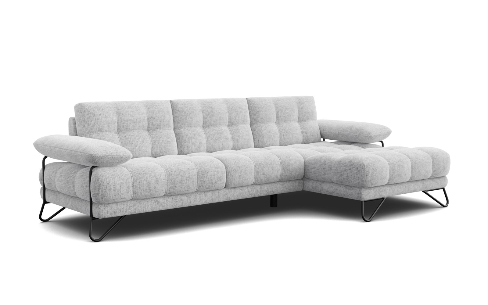 Ein wesentliches Designelement, das dieses Modell von herkömmlichen Eckcouches abhebt, sind die außergewöhnlichen Füße. Die schwarz lackierten, schleifenförmigen Metallbeine setzen einen modernen, fast schon industriellen Akzent, der wunderbar mit dem weichen Bezugsstoff korrespondiert. Diese Konstruktion sorgt nicht nur für absolute Stabilität, sondern verleiht dem gesamten Möbelstück eine gewisse Leichtigkeit, als würde es im Raum schweben. Der Loft-Charakter, der durch diese Beine entsteht, harmoniert exzellent mit dem hellgrauen Stoff.
