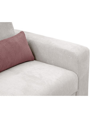 Ein weiterer Aspekt, der dieses Möbelstück so besonders macht, ist die sorgfältige Verarbeitung des Cordstoffes. Die breiten Streifen sind nicht nur ein modisches Detail, sondern betonen die Form des Möbels auf raffinierte Weise. Das Zusammenspiel aus dem hellen Stoff und den dezenten, vier Zentimeter hohen braunen Füßen schafft einen warmen Kontrast, der das Gesamtbild erdet, ohne die visuelle Leichtigkeit zu stören. Hier vereinen sich Design und Wohnlichkeit zu einer perfekten Symbiose.