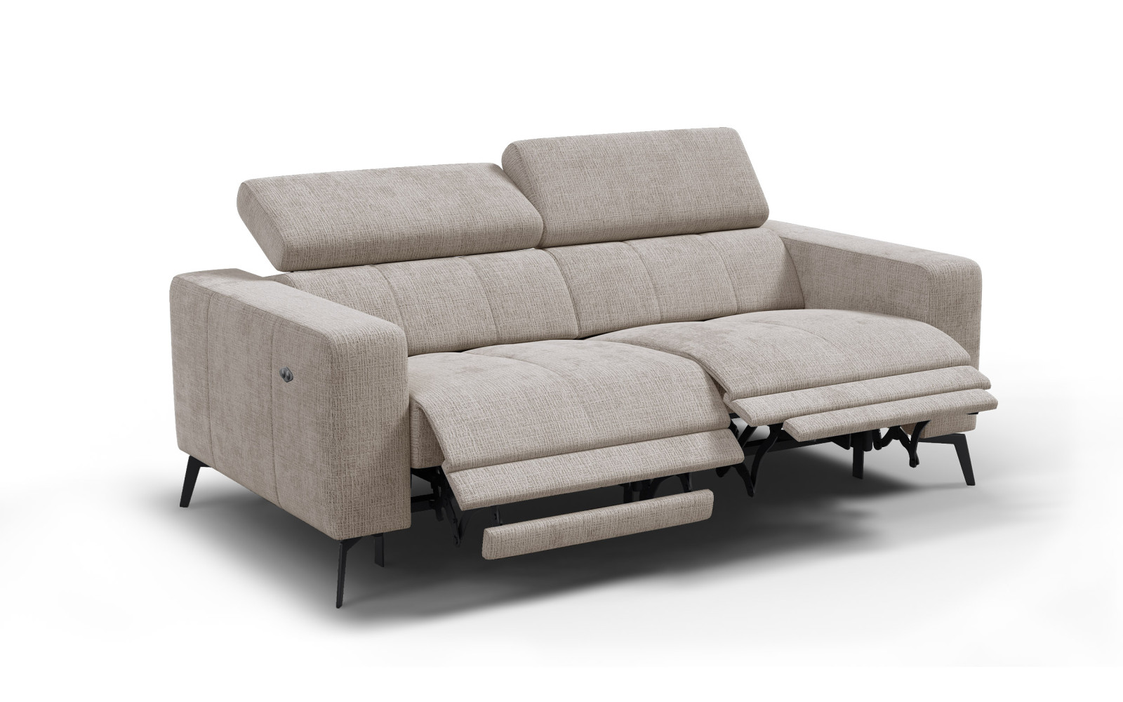 Getragen wird das Sofa von eleganten, schwarzen Füßen, die einen modernen Kontrast bilden. Die Besonderheit dieses 3-Sitzers liegt in der Ausstattung mit gleich zwei elektrischen Relaxfunktionen an den äußeren Sitzen. Dies ermöglicht es zwei Personen gleichzeitig, individuellen Luxus zu genießen, während der mittlere Platz als gemütliche Verbindung dient.