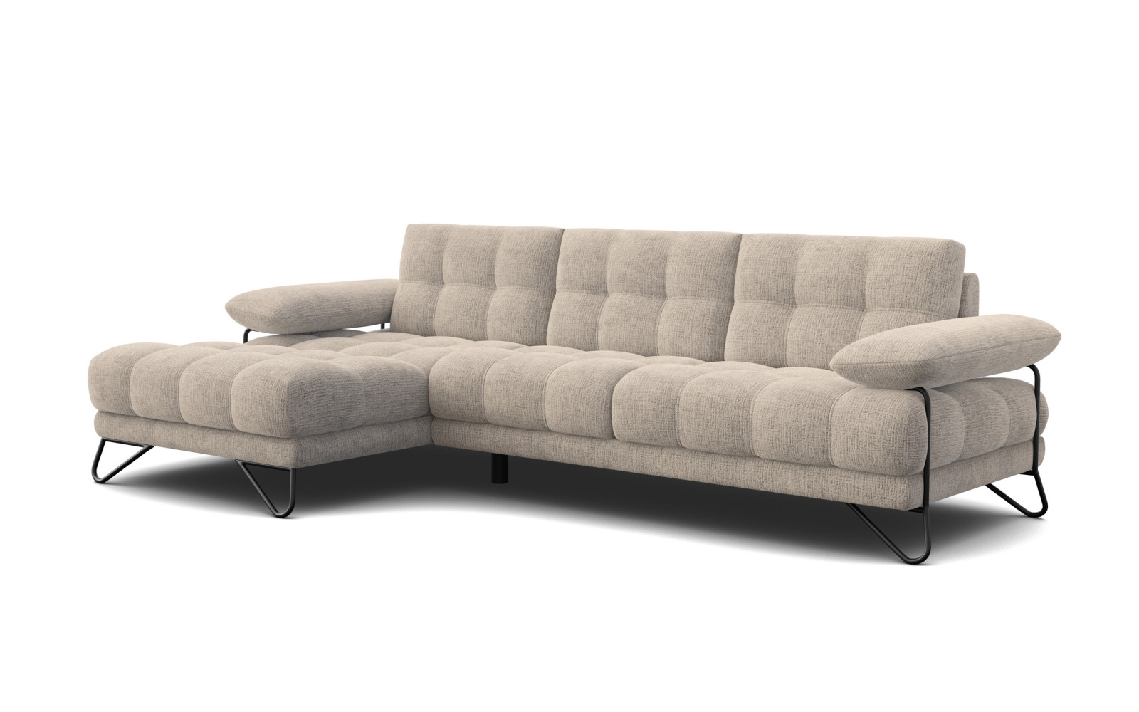 Die Armlehnen sind so konzipiert, dass sie maximalen Komfort bieten. Sie sind massiv, jedoch höher angesetzt und ragen leicht über den Korpus hinaus. Dies verleiht dem BUBBARA Ecksofa 4-Sitzer links, beige eine gewisse visuelle Originalität und bietet gleichzeitig eine perfekte Stütze für entspannte Lesestunden oder gemütliche Fernsehabende.