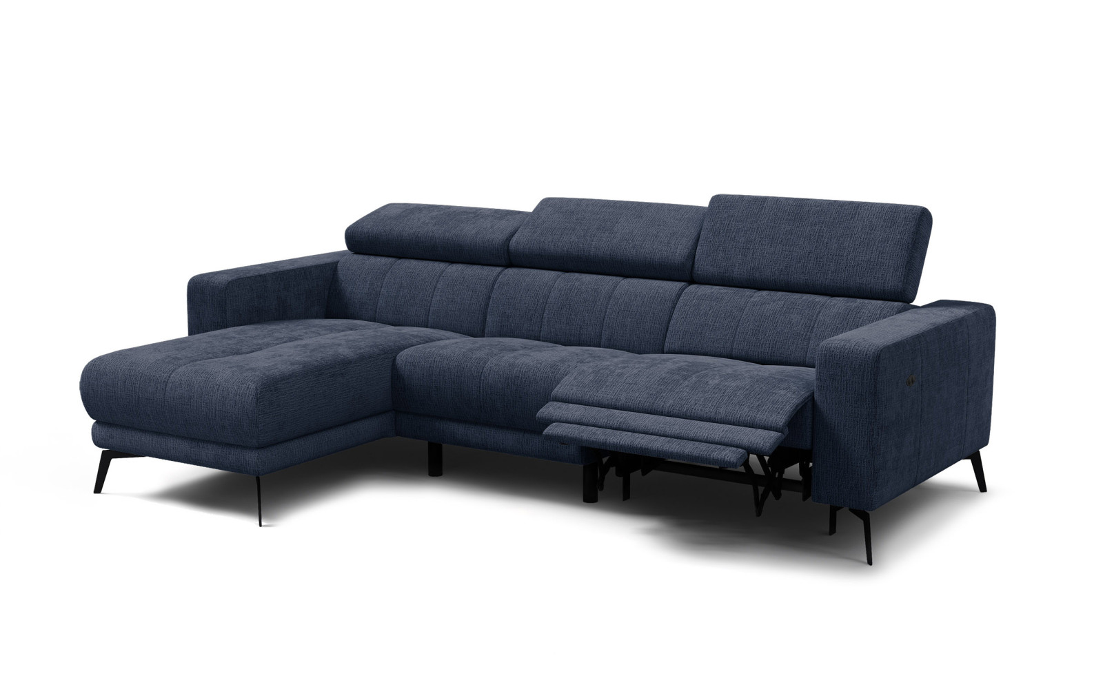 Ecksofa 4-Sitzer MORELLO in marineblauem Chenille-Stoff, weich im Griff und strapazierfähig (45.000 Martindale), für langlebigen Komfort und ein angenehmes Sitzgefühl.